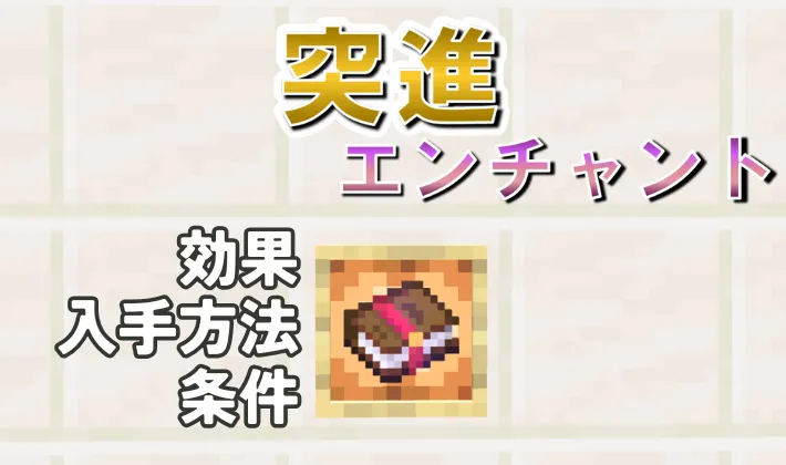 | 村人取引 (司書) | 入手可能 | 村人(司書)がランダムなエンチャントの本を取引アイテムとして提示します。職業ブロック(書見台)の撤去と再設置を繰り返す「司書ガチャ」で、目的のエンチャントの本「突進」を確実に入手できます。 |